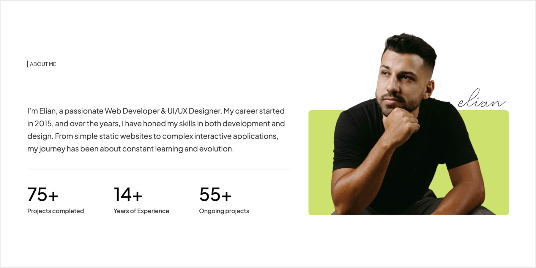 Elian is a sleek, customizable portfolio website designed for showcasing your work with style. Its intuitive interface and elegant templates highlight your creativity, making it easy to present and share your achievements.